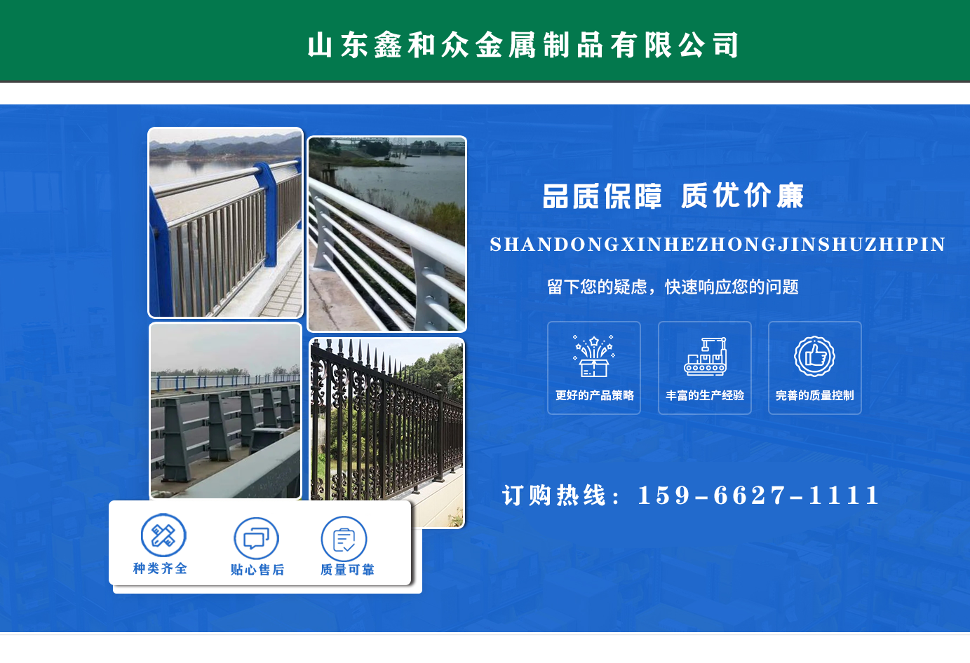 山東鑫和眾金屬制品有限公司主要產(chǎn)品有防撞護欄,橋梁護欄,道路護欄,河道護欄,不銹鋼護欄等護欄。提供設(shè)計方案,一站式定制,包您滿意價格優(yōu)惠,歡迎來電咨詢! 公司常年從事銷售護欄防撞護欄,橋梁護欄,道路護欄,河道護欄,不銹鋼護欄,橋梁鋼護欄,河道燈光護欄等。產(chǎn)品廣泛應(yīng)用于橋梁、河道、旅游景區(qū)、道路、公路、公園、小區(qū)、景觀、道路防撞等領(lǐng)域?! 」井a(chǎn)品均采用優(yōu)質(zhì)不銹鋼材料,符合相關(guān)標(biāo)準(zhǔn)。各種型號不銹鋼復(fù)合管及護欄,質(zhì)量嚴格把控。產(chǎn)品強度高、耐腐蝕、焊接牢固、抗沖擊、性能好,防撞護欄結(jié)構(gòu)簡單、美觀實用大方?! g迎前來訂購!...